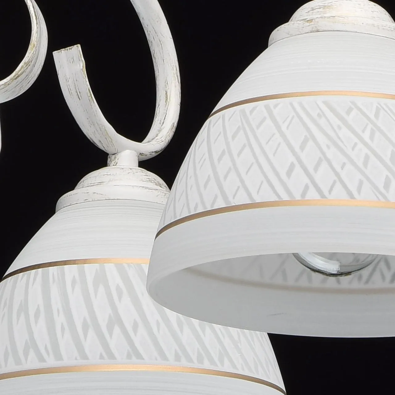 Металлическое основание, окрашенное в белый цвет с золотистой патиной . Плафоны из стекла, отлитого
