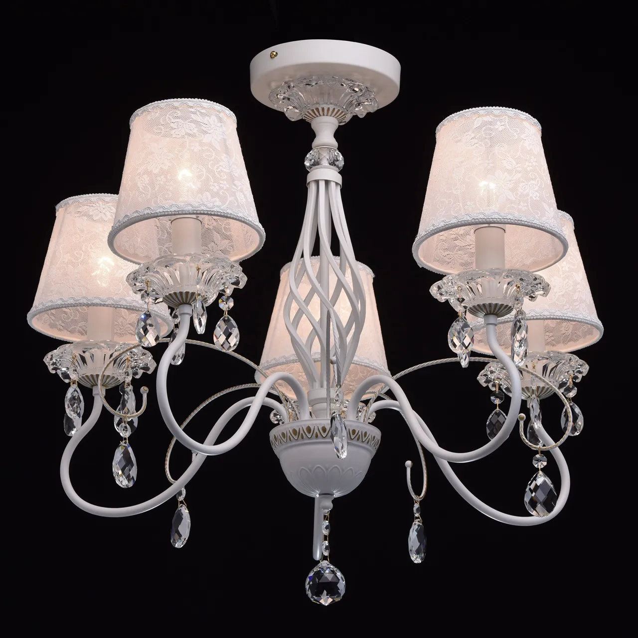 Металлическое основание белого цвета с золотистой патиной. Абажуры: из кружева. Декор: массив хрус